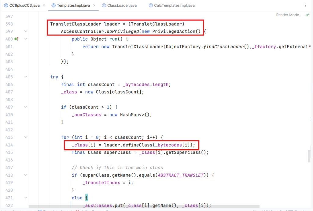 TemplatesImpl类中的defineTransletClasses()方法new了一个TransletClassLoader对象,并且调用了defineClass()方法,此处的_bytecodes是TemplatesImpl类中的一个字段值。注意这里需要初始化_bytecodes的值