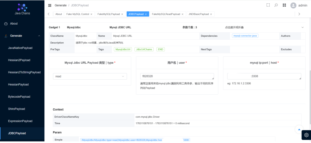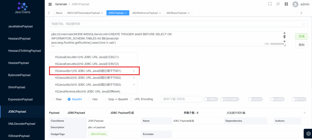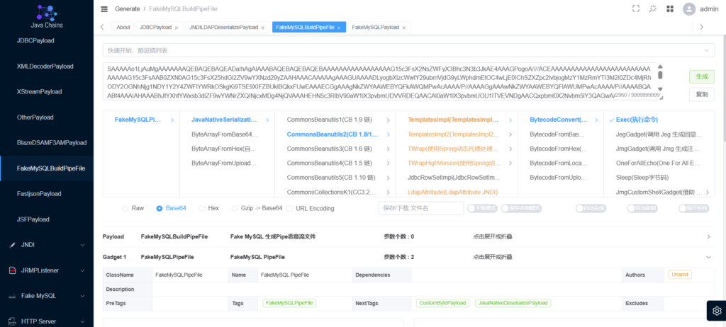 payload选择Generate–>fastjsonPayload,然后选择bcel字节码加载